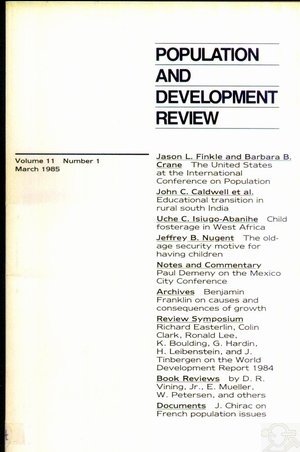 İÇİNDEKİLERPOPULATIONAND______ DEVELOPMENT REVIEW Volume 11 Number 1 March 1985 Articles Ideology and Politics at Mexico City: The United States at the 1984 International Conference on Population 1 Jason L. Finkle Barbara B. Crane Educational Transition in Rural South India 29 John C. Caldwell P. H. Reddy Pat Caldwell Child Fosterage in West Africa 53 Uche C. Isiugo-Abanihe The Old-Age Security Motive for Fertility 75 Jeffrey B. Nugent Notes and Commentary Bucharest, Mexico City, and Beyond 99 Paul Demeny Archives Benjamin Franklin on the Causes and Consequences of Population Growth 107 Review Symposium World Development Report 1984 Reviews by Richard A. Easterlin/Colin Clark/Ronald Lee 1 1 3 Comments by Kenneth E. Boulding/Garrett Hardin/Harvey Leibenstein/Jan Tinbergen 131 Book Reviews Thomas Sowell, The Economics and Politics of Race: An International Perspective Daniel R. Vining, Jr. 139 Gerry Rodgers, Poverty and Population: Approaches and Evidence Eva Mueller 1 46 Gayl D. Ness and Hirofumi Ando. The Land Is Shrinking: Population Planning in Asia William Petersen 148 Gunter Steinmann (ed.), Economic Consequences of Population Change in Industrialized Countries John Ermisch 149 Ismail Sirageldin, David Salkever, and Richard W. Osborn (eds.). Evaluating Population Programs: International Experience with Cost-Effectiveness Analysis and Cost-Benefit Analysis Margaret Wolfson 1 52 Short Reviews 1 55 Documents Resolution of the UN General Assembly on the International Conference on Population, 1984 161 Jacques Chirac on French Population Issues 163 Abstracts 165 Authors for This Issue 1 70 ![]() |