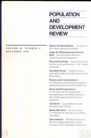 İÇİNDEKİLERPOPULATIONAND_____ DEVELOPMENT REVIEW VOLUME 18 NUMBER 4 DECEMBER 1992 ARTICLES Period Paramount? A Critique of the Cohort Approach to Fertility MAIRE NI BHROLCHAIN The Population Debate in American Popular Magazines, 1946-90 JOHN R. WILMOTH PATRICK BALL Inverted Easterlin Fertility Cycles and Kornai's "Soft" Budget Constraint ELWOOD CARLSON Children at Risk: The Role of Family Structure in Latin America and West Africa SONALDE DESAI NOTES AND COMMENTARY International Migration and Political Turmoil in the Middle East SHARON STANTON RUSSELL DATA AND PERSPECTIVES Implications of a North American Free Trade Agreement for Mexican Migration into the United States DOLORES ACEVEDO THOMAS J. ESPENSHADE ARCHIVES Leopold Kohr on the Desirable Scale of States BOOK REVIEWS J. F. Phillips and J. A. Ross (eds.). Family Planning Programmes and Fertility THOMAS K. BURCH John Ensor Harr and Peter J. Johnson, The Rockefeller Conscience: An American Family in Public and in Private CHARLES F. WESTOFF Scott J. South and Stewart E. Tolnay (eds.), The Changing American Family: Sociological and Demographic Perspectives WILLIAM PETERSEN United Nations, Child Mortality since the 1960s: A Database for Developing Countries ANNE R. PEBLEY Short Reviews DOCUMENTS The Bali Declaration on Population and Sustainable Development The Non-Aligned Summit on Population and Development Jacques Cousteau on the Demographic Implications of Man's Divorce from Nature "Warning to Humanity" - A Declaration by Scientists on Global Issues ABSTRACTS AUTHORS FOR THIS ISSUE CONTENTS TO VOLUME 18 ACKNOWLEDGMENTS ![]() |