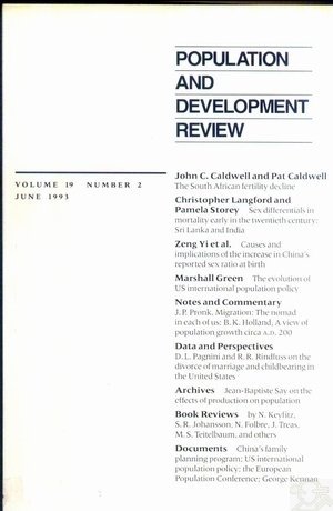 İÇİNDEKİLERPOPULATION AND______ DEVELOPMENT REVIEWVOLUME 19 NUMBER 2 JUNE 1993 ARTICLES The South African Fertility Decline JOHN C. CALDWELL PAT CALDWELL Sex Differentials in Mortality Early in the Twentieth Century: Sri Lanka and India Compared CHRISTOPHER LANGFORD PAMELA STOREY Causes and Implications of the Recent Increase in the Reported Sex Ratio at Birth in China ZENG YI TU PING Gu BAOCHANG XU YI LI BOHUA Ll YONGPING The Evolution of US International Population Policy, 1965-92: A Chronological Account MARSHALL GREEN NOTES AND COMMENTARY Migration: The Nomad in Each of Us JOHANNES P PRONK A View of Population Growth Circa A.D. 200 BART K. HOLLAND DATA AND PERSPECTIVES The Divorce of Marriage and Childbearing: Changing Attitudes and Behavior in the United States DEANNA L. PAGNINI RONALD R. RINDFUSS ARCHIVES Jean-Baptiste Say on the Effects of Production on Population BOOK REVIEWS Herve Le Bras, Marianne et les lapins: I'obsession demographique NATHAN KEYFITZ Loraine Donaldson, Fertility Transition: The Social Dynamics of Population Change S. RYAN JOHANSSON Richard A. Posner, Sex and Reason NANCY FOLBRE Richard M. Suzman, David P. Willis.and Kenneth G. Manton (eds.). The Oldest Old JUDITH TREAS Lincoln H. Day, The Future of Low-Birthrate Populations MICHAEL S. TEITELBAUM Short Reviews DOCUMENTS Accomplishments of China's Family Planning Program: A Statement by a Chinese Official US International Population Policy: An Official Statement Reeommendiations of the European Population Conference George Kennan on US Population Size and on Immigration to the US ABSTRACTS AUTHORS FOR THIS ISSUE The Population and Development Review seeks to advance1 knowledge of the interrelationships l>enveen population and socioeconomic development and provides a forum for discussion of related issues of public policy, EDITOR Paul Demeny MANAGING EDITOR Ethel P. Churchill EDITORIAL COMMITTEE Paul Demeny. Chair Susan Greenhalfjh Mead T. Cain Geoffrey McNicoll Ethel K Churchill Michael P. Todaro EDITORIAL STAFF Robert Heidel. Production Editor Diana Hrisinko. Production/Design Margaret A. Knoll, Circulation ADVISORY BOARD Ester Boserup Milos Macura Gustavo Cabrera Cannen A. Min") John C. Caldwell AsokMitra Mercedes B. Concepcidn Simeon H. Ominde Richard A. Easterlin Samuel H. Preston Akin L. Mabogunje Masri Singarimbun Signed articles arc the responsibility ol the authors. Views expressed in the Review do not necessarily relied the views of the Population Council. Direct nwnuscripts. comments on articles, and correspondence to: Population and Development Review The Population Council One Dag Hammarskjold Pla/a New Y( irk, New York 10017 US A Subscription information appears on the inside back cover. Support from the United Nations Population Fund is gratefully acknowledged. Volumes are available on microfilm from Xerox University Microfilms, 300 North Zeeb Road. Ann Arbor. Michigan 48106. Population and Development Review iISSN 0098-792 11 is published c)uarterly in March, June. September, and December at $24.00 for a one-year and $40,00 for a two-year subscription by The Population Council. One Dag Hammarskjold Pla/a. New York. ,Y 100)7 USA. Second-class postage paid ai New York Y. and additional mailing offices. I'OSTMAS TFR: Send address changes to Population and Development Review. One Dag Hammarskjold Plaza. New York. NY 10017. (c) 1993 by The Population Council. Inc. All rights reserved. Printed in the United States of America. Library of Congress Catalog Card Number: 75-27511 ISSN 0098-7921 ![]() |