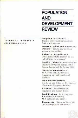 İÇİNDEKİLERPOPULATIONAND______ DEVELOPMENT REVIEW VOLUME 19 NUMBER 3 SEPTEMBER 1993 ARTICLES Theories of International Migration: A Review and Appraisal DOUGLAS S. MASSEY JOAOUIN ARANGO GRAEME HUGO ALI KOUAOUCI ADELA PELLEGRINO J. EDWARD TAYLOR Cultural and Economic Approaches to Fertility: Proper Marriage or Mesalliance? ROBERT A. POLLAK SUSAN COTTS WATKINS Will the Baby Boomers Be Less Well Off Than Their Parents? Income, Wealth, and Family Circumstances Over the Life Cycle in the United States RICHARD A. EASTERLIN CHRISTINA M. SCHAEFFER DIANE J. MACUNOVICH Contrasting Age Structures of Western Europe and of Eastern Europe and the Former Soviet Union: Demographic Curiosity or Labor Resource? DAVID A. COLEMAN NOTES AND COMMENTARY Forecasting Survival, Health, and Disability: Report on a Workshop MICHAELI A. STOTO JANE S. DURCH DATA AND PERSPECTIVES Development of Towns in China: A Case Study of Guangdong Province LAURENCE J. C. MA CHUSHENG LlN ARCHIVES Julian Huxley on Population and Human Destiny BOOK REVIEWS Elza Bcrquo and Peter Xenos (eds.). Family Systems and Cultural Change RONALD FREEDMAN F. Eelens, T. Schampers,and J.D.Speckmann (eds.), Labour ampers, and J. D. Speckmann (eds.). Labour Migration to the Middle East: From Sri Lanka to the Gulf SHARON STANTON RUSSELL Donald J. Hernandez, America's Children: Resources from Family. Government, and the Economy PETER UHLENBERG John R. Gillis, Louise A. Tilly, and David Levine (eds.), The European Experience of Declining Fertility, 1850-1970: The Quiet Revolution MYRON P GUTMANN Short Reviews DOCUMENTS 'Women's Voices '94"-A Declaration on Population Policies Recommendations of the Arab Population Conference ABSTRACTS AUTHORS FOR THIS ISSUE ![]() |