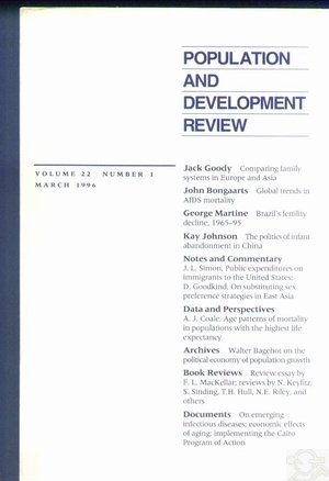 İÇİNDEKİLERPOPULATION AND______ DEVELOPMENT REVIEWVOLUME 22 NUMBER 1 MARCH 1996 ARTICLES Comparing Family Systems in Europe and Asia: Are There Different Sets of Rules? JACK GOODY Global Trends in AIDS Mortality JOHN BONGAARTS Brazil's Fertility Decline, 1965-95: A Fresh Look at Key Factors GEORGE MARTINE The Politics of the Revival of Infant Abandonment in China, with Special Reference to Hunan KAY JOHNSON NOTES AND COMMENTARY Public Expenditures on Immigrants to the United States, Past and Present JULIAN L. SIMON On Substituting Sex Preference Strategies in East Asia: Does Prenatal Sex Selection Reduce Postnatal Discrimination? DANIEL GOODKIND DATA AND PERSPECTIVES Age Patterns and Time Sequence of Mortality in National Populations with the Highest Expectation of Life at Birth ANSLEY J. COALE ARCHIVES Walter Bagehot on the Political Economy of Population Growth BOOK REVIEWS On Human Carrying Capacity: A Review Essay on Joel Cohen's How Many People Can the Earth Support? F. LANDIS MACKELLAR Paul R. Ehrlich, Anne H. Ehrlich, and Gretchen C. Daily, The Stork and the Plow: The Equity Answer to the Human Dilemma NATHAN KEYFITZ Oscar Harkavy, Curbing Population Growth: An Insider's Perspective on the Population Movement STEVEN SINDING Warren C. Sanderson and Jee-Peng Tan, Population in Asia TERENCE H. HULL Dorothy Stein, People Who Count: Population and Politics, Women and Children NANCY E. RILEY short Reviews DOCUMENTS The National Science and Technology Council on Emerging and Re-emerging Infectious Diseases The Council of Economic Advisers on the Economic Effects of Aging Nafis Sadik on Implementation of the Cairo Program of Action ABSTRACTS AUTHORS FOR THIS ISSUE ![]() |