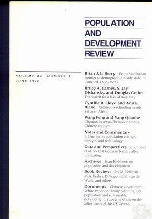 İÇİNDEKİLERPOPULATIONAND______ DEVELOPMENT REVIEW VOLUME 22 NUMBER 2 JUNE 1996 ARTICLES From Malthusian Frontier to Demographic Steady State: The Concordian Birth Rate, 1635-1993 BRIAN J. L. BERRY Continuing the Search for a Law of Mortality BRUCE A. CARNES S. JAY OLSHANSKY DOUGLAS GRAHN Children's Schooling in sub-Saharan Africa: The Role of Fathers, Mothers, and Others CYNTHIA B. LLOYD ANN K. BLANC Age at Marriage and the First Birth Interval: The Emerging Change in Sexual Behavior Among Young Couples in China WANG FENG YANG QUANHE NOTES AND COMMENTARY Population Change, Lifestyle, and Technology: How Much Difference Can They Make? FAYE DUCHIN DATA AND PERSPECTIVES East German Fertility After Unification: Crisis or Adaptation? CHRISTOPH CONRAD MICHAEL LECHNER WELF WERNER ARCHIVES Joan Robinson on Population and Development BOOK REVIEWS Richard A. Posner, Aging and Old Age MARK PERLMAN Nancy Folbre, Who Pays for the Kids? Gender and the Structures of Constraint MARIANNE A. FERBER Karen Oppenheim Mason and An-Magritt Jensen (eds.), Gender and Family Change in Industrialized Countries DAVID POPENOE Janet Farrell Brodie, Contraception and Abortion in Nineteenth-Century America ETIENNE VAN DE WALLE Short Reviews DOCUMENTS Chinese Government White Paper on Family Planning US Population and Sustainable Development The Supreme Court on the Adjustment of the US Census ABSTRACTS AUTHORS FOR THIS ISSUE ![]() |