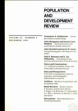 İÇİNDEKİLERPOPULATION AND______ DEVELOPMENT REVIEWVOLUME 22 NUMBER 4 DEC EMBER 1996 ARTICLES Disease Prevention as Social Change: Toward a Theory of Public Health CONSTANCE A. NATHANSON Social Interactions and Contemporary Fertility Transitions JOHN BONGAARTS SUSAN COTTS WATKINS Post-Cairo Population Policy: Does Promoting Girls' Schooling Miss the Mark? JOHN KNODEL GAVIN W. JONES Forecasting US Age Structure and the Future of Social Security: The Impact of Adjustments to Official Mortality Schedules NEIL G. BENNETT S. JAY OLSHANSKY NOTES AND COMMENTARY Fertility, Family, and Social Policy in Contemporary Western Europe JEAN-CLAUDE CHESNAIS DATA AND PERSPECTIVES Immigration, Domestic Migration, and Demographic Balkanization in America: New Evidence for the 1990s WILLIAM H. FREY ARCHIVES Helvetius on Population and the Political Order BOOK REVIEWS Population Stabilizes, Economic Growth Continues? A Review Essay on Richard Easterlin's Growth Triumphant: The Twenty-first Century in Historical Perspective PAUL STREETEN Andre Burguiere, Christiane Klapisch-Zuber, Martine Segalen, and Franchise Zonabend (eds.), A History of the Family, Volume One: Distant Worlds, Ancient Worlds; Volume Two: The Impact of Modernity EDWARD SHORTER Herman E. Daly, Beyond Growth: The Economics of Sustainable Development PETER ROGERS Shireen J. Jejeebhoy, Women's Education, Autonomy, and Reproductive Behaviour: Experience from Developing Countries JERE R. BEHRMAN David M. Heer, Immigration in America's Future: Social Science Findings and the Policy Debate THOMAS J. ESPENSHADE Maria Sophia Quinc, Population Politics in Twentieth-Century Europe: Fascist Dictatorships and Liberal Democracies DAVID L. SILLS Richard Leete, Malaysia's Demographic Transition: Rapid Development, Culture, and Politics JULIE DAVANZO Kim Hill and A. Magdalena Hurtado, Ache Life History: The Ecology and Demography of a Foraging People NANCY HOWELL William G. Hollingsworth, Ending the Explosion: Population Policies and Ethics for a Humane Future CARL HAUB Short Reviews DOCUMENTS The Rome Declaration on World Food Security ABSTRACTS AUTHORS FOR THIS ISSUE CONTENTS TO VOLUME 22 ACKNOWLEDGMENTS ![]() |