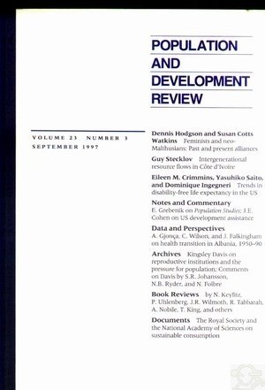 İÇİNDEKİLERPOPULATIONAND______ DEVELOPMENT REVIEW VOLUME 23 NUMBER 3 SEPTEMBER 1997 ARTICLES Feminists and Neo-Malthusians: Past and Present Alliances DENNIS HODGSON SUSAN COTTS WATKINS Intergenerational Resource Flows in Cote d'lvoire: Empirical Analysis of Aggregate Flows GUY STECKLOV Trends in Disability-Free Life Expectancy in the United States, 1970-90 EILEEN M. CRIMMINS YASUHIKO SAITO DOMINIQUE INGEGNERI NOTES AND COMMENTARY REMARKS BY E. GREBENIK AND JOEL COHEN ON RECEIVING THE OLIVIA SCHIEFFELIN NORDBERG AWARD On Population Studies: Its Origin and Outlook E. GREBENIK Why Should More United States Tax Money Be Used to Pay for Development Assistance in Poor Countries? JOEL E. COHEN DATA AND PERSPECTIVES Paradoxes of Health Transition in Europe's Poorest Country: Albania 1950-90 ARJAN GJONÇA CHRIS WILSON JANE FALKINGHAM ARCHIVES Kingsley Davis on Reproductive Institutions and the Pressure for Population THE FUTURE OF THE FAMILY: THREE COMMENTS ON DAVIS 1937 Fertility and Family History: Using the Past to Explain the Present S. RYAN JOHANSSON Reflections on Reproductive Institutions NORMAN B. RYDER The Future of the Elephant-Bird NANCY FOLBRE BOOK REVIEWS Arlie Russell Hochschild, The Time Bind: When Work Becomes Home and Home Becomes Work John P. Robinson and Geoffrey Godbey, Time for Life: The Surprising Ways Americans Use Their Time NATHAN KEYFITZ Shirley P. Burggraf, The Feminine Economy and Economic Man: Revising the Role of Family in the Post-Industrial Age PETER UHLENBERG Richard Lynn, Dysgenics: Genetic Deterioration in Modern Populations JOHN R. WILMOTH Carla Makhlouf Obermeyer (ed.). Family, Gender, and Population in the Middle East: Policies in Context RIAD TABBARAH Carl Ipsen, Dictating Demography: The Problem of Population in Fascist Italy ANNUNZIATA MOBILE David Jacobson, Rights Across Borders: Immigration and the Decline of Citizenship TIMOTHY KING Short Reviews DOCUMENTS The Royal Society and the National Academy of Sciences on Sustainable Consumption ABSTRACTS AUTHORS FOR THIS ISSUE ![]() |