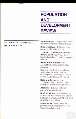 İÇİNDEKİLERPOPULATIONAND______ DEVELOPMENT REVIEW VOLUME 23 NUMBER 4 DECEMBER 1997 ARTICLES Economic Growth, Disruption, Deprivation, Disease, and Death: On the Importance of the Politics of Public Health for Development SIMON SZRETER Deliberate Birth Control Under a High-Fertility Regime: Reproductive Behavior in China Before 1970 ZHONGWEI ZHAO Implications of the 1996 Welfare and Immigration Reform Acts for US Immigration THOMAS J. ESPENSHADE JESSICA L. BARAKA GREGORY A. HUBER NOTES AND COMMENTARY The Global Fertility Transition: The Need for a Unifying Theory JOHN C. CALDWELL QUALITATIVE METHODS IN POPULATION STUDIES: A SYMPOSIUM Qualitative Methods: A Key to a Better Understanding of Demographic Behavior? CARLA MAKHLOUF OBERMEYER Methods and Meanings: Reflections on Disciplinary Difference SUSAN GREENHALGH The Uses of Culture in Demographic Research: A Continuing Place for Community Studies TOM FRICKE Can Economics Mediate the Relationship Between Anthropology and Demography? VIJAYENDRA RAO Qualitative and Quantitative Approaches to Historical Demography DAVID I. KERTZER A Case for Nonanthropological Qualitative Methods for Demographers JOHN KNODEL DATA AND PERSPECTIVES The Immigrant Subsidy in US Agriculture: Farm Employment, Poverty, and Welfare J. EDWARD TAYLOR PHILIP L. MARTIN ARCHIVES Polybius on Fertility Control in Ancient Greece BOOK REVIEWS Donald O. Mitchell, Merlinda D. Ingco, and Ronald C. Duncan, The World Food Outlook: A Review Essay by Nikos Alexandratos Jared Diamond, Guns, Germs, and Steel: The Fates of Human Societies GARRETT HARDIN James Z. Lee and Cameron D. Campbell, Fate and Fortune in Rural China: Social Organization and Population Behavior in Liaoning. 1774-1873 STEVAN HARRELL Yves Blayo, Des politiques demographiques en Chine ALPHONSE L. MACDONALD Jane C. Schneider and Peter T. Schneider, Festival of the Poor: Fertility Decline and the Ideology of Class in Sicily, 1860-1980 MASSIMO LIVI-BACCI John Leslie, The End of the World: The Science and Ethics of Human Extinction GEOFFREY MCNICOLL Short Reviews DOCUMENTS Fidel Ramos on Globalization, Population Policy, and Demographic Development China's Population Policy ABSTRACTS AUTHORS FOR THIS ISSUE CONTENTS TO VOLUME 23 ![]() |