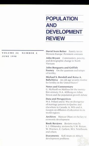 İÇİNDEKİLERPOPULATION AND______ DEVELOPMENT REVIEWVOLUME 24 NUMBER 2 JUNE 1998 ARTICLES Family Ties in Western Europe: Persistent Contrasts DAVID SVEN REHER Communism, Poverty, and Demographic Change in North Vietnam JOHN BRYANT On the Quantum and Tempo of Fertility JOHN BONGAARTS GRIFFITH FEENEY An Old-Age Security Motive for Fertility in the United States? MICHAEL S. RENDALL RAISA A. BAHCHIEVA NOTES AND COMMENTARY Malthus for the Twenty-First Century GEOFFREY McNICOLL Julian Simon and the Population Growth Debate DENNIS A. AHLBURG DATA AND PERSPECTIVES Divergence of Marriage Patterns in Quebec and Elsewhere in Canada MICHAEL S. POLLARD ZHENG WU Diffusion of Education in Six World Regions, 1960-90 ANNABABETTE WILS ANNE GOUJON ARCHIVES Mancur Olson on the Key to Economic Development BOOK REVIEWS On the Biodemography of Aging: A Review Essay of Between Zeus and the Salmon, eds. Kenneth W. Wachter and Caleb E. Finch S. JAY OLSHANSKY Gordon Conway, The Doubly Green Revolution: Food for All in the Twenty-first Century VERNON W. RUTTAN John Pullen and Trevor Hughes Parry (eds.), T. R. Malthus: The Unpublished Papers in the Collection of Kanto Gakuen University, Vol. I WILLIAM PETERSEN Pal Peter Toth and Emil Valkovics (eds.), Demography of Contemporary Hungarian Society ELWOOD CARLSON William Petersen, Ethnicity Counts MICHAEL S. TEITELBAUM Short Reviews DOCUMENTS Kofi Anan on Africa's Development Problems ABSTRACTS AUTHORS FOR THIS ISSUE ![]() |