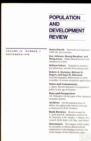 İÇİNDEKİLERPOPULATION AND______ DEVELOPMENT REVIEWVOLUME 24 NUMBER 3 SEPTEMBER 1 998 ARTICLES International Migration 1965-96: An Overview HANIA XLOTNIK Infant Abandonment and Adoption in China KAY JOHNSON HUANG BANGHAN WANG LIYAO Population Statistics, the Holocaust, and the Nuremberg Trials WILLIAM SELTZER Sociodemographic Differentials in Adult Mortality: A Review of Analytic Approaches ROBERT A. HUMMER RICHARD G. ROGERS ISAAC W. EBERSTEIN NOTES AND COMMENTARY Population Policy in the Age of Fascism: Observations on Recent Literature CARL IPSEN DATA AND PERSPECTIVES Is the Pace of Japanese Mortality Decline Converging Toward International Trends? JOHN R. WILMOTH ARCHIVES On the Populousness of Africa: An Eighteenth-Century Text John Hippisley on the Populousness of Africa: A Comment R. MANSELL PROTHERO BOOK REVIEWS Nature's Services, Human Follies: A Review Essay on Gretchen C. Daily (ed.), Nature's Services: Societal Dependence on Natural Ecosystems; Julian L. Simon, The Ultimate Resource 2; and Ernst von Weizsacker, Amory B. Lovins, and L. Hunter Lovins, Factor Four: Doubling Wealth. Halving Resource Use VACLAV SMIL Medicine and Its Blessings: A Review Essay on Roy Porter, The Greatest Benefit to Mankind: A Medical History of Humanity from Antiquity to the Present S. RYAN JOHANSSON Samuel Hollander, The Economics of Thomas Robert Malthus WILLIAM PETERSEN Noble David Cook, Born to Die: Disease and New World Conquest, 1492-1650 ALFRED W. CROSBY James P. Smith and Barry Edmonston (eds.). The Immigration Debate: Studies on the Economic, Demographic, and Fiscal Effects of Immigration JOHN ISBISTER Myron Weiner and Tadashi Hanami (eds.), Temporary Workers or Future Citizens? Japanese and U.S. Migration Policies B. LINDSAY LOWELL Richard E. Bilsborrow (ed.), Migration, Urbanization, and Development: New Directions and Issues MARY M. KRITZ Bill McKibben, Maybe One: A Personal and Environmental Argument for Single-Child Families LINCOLN H. DAY Short Reviews DOCUMENTS The United Nations on the Impact of HIV/AIDS on Adult Mortality in sub-Saharan Africa UNICEF on Deficient Birth Registration in Developing Countries The World Bank on the Social Impact of the Indonesian Crisis ABSTRACTS AUTHORS FOR THIS ISSUE ![]() |