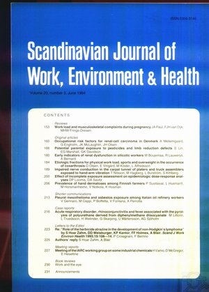 İÇİNDEKİLERCONTENTSReviews 153 Work load and musculoskeletal complaints during pregnancy JA Paul, FJH van Dijk, MHW Frings-Dresen Original articles 160 Occupational risk factors for renal-cell carcinoma in Denmark A Mellemgaard, G Engholm, JK McLaughlin, JH Olsen 166 Potential parental exposure to pesticides and limb reduction defects S Lin, EG Marshall, GK Davidson 180 Early indicators of renal dysfunction in silicotic workers W Boujemaa, R Lauwerys, A Bernard 184 Etiologic fractions for physical work load, sports and overweight in the occurrence of coxarthrosis O Olsen, E Vingard, M Koster, L Alfredsson 189 Impaired nerve conduction in the carpal tunnel of platers and truck assemblers exposed to hand-arm vibration T Nilsson, M Hagberg, L Burstrom, S Kihlberg 200 Effect of incomplete exposure assessment on epidemiologic dose-response analyses DP Loomis, DA Savitz 206 Prevalence of hand dermatoses among Finnish farmers P Susitaival, L Husmant, .M Horsmanheimo, V Notkola, K Husman Shorter communications 213 Pleural mesothelioma and asbestos exposure among Italian oil refinery workers V Gennaro, M Ceppi, P Boffetta, V Fontana, A Perrotta Case reports 216 Acute respiratory disorder, rhinoconjunctivitis and fever associated with the pyrol-ysis of polyurethane derived from diphenylmethane diisocyanate M Littorin, L Truedsson, H Welinder, G Skarping, U Martensson, AG Sjoholm Letters to the Editor 223 Re: "Role of the herbicide atrazine in the development of non-Hodgkin's lymphoma" by S Hoar Zahm, DD Weisburger, KP Kantor, FF Holmes, A Blair. ScandJ Work Environ Health 1993;19:108-14. P Crosignani, F Berrino 225 Authors'reply S Hoar Zahm, A Blair Meeting reports 227 Meeting of the IARC working groupon some industrial chemicals H Valnio, D McGregor, E Heseltine Book reviews 230 Work and the eye 231 Announcements ![]() |