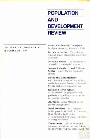 İÇİNDEKİLERARTICLESSmallpox in Nineteenth-Century India JAYANT BANTHIA TIM DYSON The Global and Regional Impact of Mortality and Fertility Transitions, 1950-2000 PATRICK HEUVELINE The Persistence of Outmoded Contraceptive Regimes: The Cases of Mexico and Brazil JOSEPH E. POTTER Longer Life and Population Growth JOSHUA R. GOLDSTEIN WILHELM SCHLAG NOTES AND COMMENTARY The Long-Term Effect of the Timing of Fertility Decline on Population Size BRIAN C. O'NEILL SERGEI SCHERBOV WOLFGANG LUTZ DATA AND PERSPECTIVES Urban Growth in Developing Countries: A Review of Projections and Predictions MARTIN BROCKERHOFF ARCHIVES Alfred Marshall on the Growth of Population BOOK REVIEWS Christopher Wills, Children of Prometheus: The Accelerating Pace of Human Evolution TIMOTHY CRIPPEN Helen Fisher, The First Sex: The Natural Talents of Women and How They Are Changing the World and Lionel Tiger, The Decline of Males DENNIS HODGSON Francis Fukuyama, The Great Disruption: Human Nature and the Reconstitution of Social Order GEOFFREY MCNICOLL Tom Kirkwood, Time of Our Lives: The Science of Human Aging KENNETH G. MANTON Margo J. Anderson and Stephen E. Fienberg, Who Counts? The Politics of Census-Taking in Contemporary America HARVEY M. CHOLDIN Alain Desrosieres, The Politics of Large Numbers: A History of Statistical Reasoning WILLIAM PETERSEN Henk A. de Cans, Population Forecasting1895-1945: The Transition to Modernity JOCHEN FLEISCHHACKER Massimo Livi-Bacci and Gustavo De Santis (eds.), Population and Poverty in the Developing World STAN D'SOUZA William A. Jackson, The Political Economy of Population Ageing EMILY GRUNDY Dorothy J. Solinger, Contesting Citizenship in Urban China: Peasant Migrants, the State, and the Logic of the Market WANG FENG Short Reviews DOCUMENTS CDC on Infant and Maternal Mortality in the United States: 1900-99 The HIV/AIDS Epidemic at the End of 1999 ABSTRACTS AUTHORS FOR THIS ISSUE CONTENTS TO VOLUME 25 ![]() |