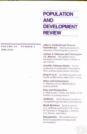 İÇİNDEKİLERARTICLESHistorical Population Estimates: Unraveling the Consei JOHN C. CALDWELL THOMAS SCHINDLMAYR The Epidemiologic Transition Revisited: Compositiona Models for Causes of Death by Age and Sex JOSHUA A. SALOMON CHRISTOPHER J. L. MURRAY On the Modernity of Traditional Contraception: Time a the Social Context of Fertility JENNIFER JOHNSON-HANKS Sociodemographic and Health Profiles of the Oldest Ol ZENG YI JAMES W. VAUPEL XIAO ZHENYU ZHANG CHUNYUAN NOTES AND COMMENTARY Sex Differentials in Undernutrition: A Look at Survey Evidence ALAIN MARCOUX DATA AND PERSPECTIVES A Turning Point in Gender Bias in Mortality? An Update on the Number of Missing Women STEPHAN KLASEN CLAUDIA WINK ARCHIVES David Riesman on Phases of Population Growth and Social Character BOOK REVIEWS Does Population Matter? A Review Essay DENNIS A. AHLBURG Andrew Mason (ed.), Population Change and Economic Development in East Asia: Challenges Met, Opportunities Seized GAVIN W. JONES Emma Rothschild, Economic Sentiments: Adam Smith, Condorcet, and the Enlightenment WILLIAM PETERSEN Klaus M. Leisinger, Karin Schmitt, and Rajul Pandya-Lorch, Six Billion and Counting: Population Growth and Food Security in the 21 st Century PAUL WAGGONER Barry Bogin, The Growth of Humanity JOHN KOMLOS Nigel Harris, Thinking the Unthinkable: The Immigration Myth Exposed DOUGLAS S. MASSEY Short Reviews DOCUMENTS The Global Science Panel on Population in Sustainable Development ABSTRACTS AUTHORS FOR THIS ISSUE ![]() |
