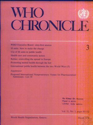 İÇİNDEKİLERWHO Executive Board: sixty-first session SI units: how to make the change Use of SI units in public healthHealth care and community action-G. Donoso Rabies: controlling the spread in Europe Promoting mental health through the law-T W. Harding & W. J. Curran International public health: the organizational problems between the two World Wars (5)N. Howard-Jones From the Regions Notes and news: Solid progress in the Onchocerciasis Control Programme in the Volta River Basin area (OCP)-Recent trends in tuberculosis control in Romania-Primary health care: report of a WHO Regional Expert Committee Recent WHO publications ![]() |