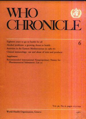 İÇİNDEKİLEREighteen years to go to health for all Alcohol problems: a growing threat to healthActivities in the Eastern Mediterranean in 1980-81: highlights of the Regional Director's report From the Regions Americas: Dr Carlyle Guerra de Macedo elected new Director of PASB Europe:Drug prescribing by the general practitioner: Eleventh European Symposium on Clinical Pharmacological Evaluation in Drug Control Notes and news Clinical immunology: use and abuse of tests and products Primary prevention of hypertension Diarrhoeal Diseases Control Programme Life expectancy in developed countries Medical school update The Koch centenary at year's end Recent WHO publications Supplement: Recommended International Nonproprietary Names for Pharmaceutical Substances: List 22 ![]() |