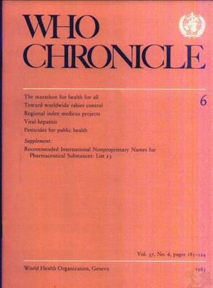 İÇİNDEKİLERThe marathon for health for all Halfdan MahlerToward worldwide rabies control G. W. Beran & A. J. Crowley Regional index medicus projects Viral hepatitis Friedrich Deinhardi, Jochen Abb & Fakhry Assaad From the Regions Americas: Lessons learned from the flood emergency in Ecuador Eastern Mediterranean: Feeding of children with acute diarrhoea Western Pacific: International travel and its health risks Notes and news Pesticides for public health: collaboration with industry to be strengthened Cholera in 1982 WHO intensifies research in immunology of tuberculosis Manual of fertility analysis WHO recommends that 33 benzodiazepines be available on prescription only Uprooting and health: the student from abroad Saint Vincent and the Grenadines are newest WHO Member Recent WHO publications Supplement: Recommended International Nonproprietary Names for Pharmaceutical Substances: List 23 ![]() |