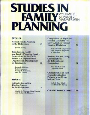 İÇİNDEKİLERContents ARTICLES Natural Family Planning in the Philippines John E. Laing Transferring Health and Family Planning Service Innovations to the Public Sector: An Experiment in Organization Development in Bangladesh James F. Phillips, Ruth Simmons, George B. Simmons, and Md. Yunus REPORTS Attitudes toward the Rhythm Method in the Philippines Cecilia C. Verzosa, Nora Llamas, and Richard T. Mahoney Comparison of Rigid an Flexible Cannulae for Early Abortion without Cervical Dilatation World Health Organization Task Force on Sequelae of Abortion Reasons for Not Using Contraceptives: An International Comparison Neal Kar Nair and Lawrence Smith Characteristics of First Trimester Abortion Patients at an Urban Indian Clinic Sudesh Bahl Dhall and Philip D. Harvey CURRENT PUBLICATIONS ![]() |
