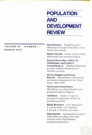 İÇİNDEKİLERARTICLESPopulation Policy Dilemmas in Europe at the Dawn of the Twenty-First Century paul demeny Urban-Rural Mortality Differentials: An Unresolved Debate robert woods Shifting Childrearing to Single Mothers: Results from 17 Western Countries patrick heuveline jeffrey M.timberlake frank F. furstenberg, jr. Measurement of Household and Family Composition in the United States, 1850-2000 steven ruggles susan browerNOTES AND COMMENTARY Cultural Diversity and Population Policy in Nigeria oka obono ARCHIVES Ansley J. Coale on Increases in Expectation of Life and Population Growth BOOK REVIEWS Philipp Ther and Ana Siljak (eds.), Redrawing Nations: Ethnic Cleansing in East-Central Europe, 1944-1948 rainer mackensen Rainer Mackensen (ed.), Bevölkerungslehre und Bevölkerungspolitik vor 1933 ETİENNE VAN DE WALLE Caroline H. Bledsoe, Contingent Lives: Fertility, Time, and Aging in West Africa john b. casterlıne Alan Booth and Ann C. Crouter (eds.). Just Living Together: Implications of Cohabitation on Families, Children, and Social Policy elizabeth fussell Nancy A. Denton and Stewart E. Tolnay (eds.),American Diversity: A Demographic Challenge for the 21st Century lee bouvier Short ReviewsDOCUMENTS Demographic Prospects 2000-2050 According to the 2002 Revision of the United Nations Population Projections ABSTRACTS AUTHORS FOR THIS ISSUE ![]() |