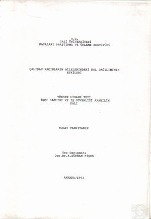 İÇİNDEKİLERİÇİNDEKİLERTABLOLAR DİZİNİ GRAFİKLER DİZİNİ GİRİŞ VE AMAÇ 1. BÖLÜM GENEL BİLGİLER 1. AİLEYE GENEL BAKIŞ 1. AİLENİN TANIMI VE FDNKSİYDNLARI 2. GEÇMİŞTEN GÜNÜMÜZE AİLE 3. RDL VE CİNSEL ROL II. KADININ EKDNDMİK VE SOSYAL STATÜSÜ II. BÖLÜM KADINLARIN ÇALIŞMASI VE SORUNLARI I. KADINLARIN ÇALIŞMA YAŞAMINA KATILIMI II. ÇALIŞMA YAŞAMI İLE İLGİLİ SORUNLAR 1. EĞİTİM SORUNU 2. İSTİHDAM SORUNU 3. REKABET GÜÇSÜZLÜĞÜ 4. ÜCRET SORUNU 5. SAĞLIK SORUNU 6. İKİLİ İŞ YÜKÜ 7. MOBİLİTE YETERSİZLİĞİ 8. ABSENTİZM 9. ULAŞIM SORUNU III. BÖLÜM ÇALIŞAN KADINLARI ÖZEL OLARAK KORUYUCU YASA HÜKÜMLERİ VE SONUÇLARI I. ULUSAL DÜZEYDE II. ULUSLARARASI DÜZEYDE MATERYAL VE YÖNTEM 1. Anketin Hazırlanması 2. Anketin Kapsamı 3. Grupların Belirlenmesi BULGULAR 1. GENEL DEĞERLENDİRME 2. KARŞILAŞTIRMALI DEĞERLENDİRME TARTIŞMA VE SDNUÇ ÖZET ABSTRACT (İNGİLİZCE ÖZET) TABLOLAR GRAFİKLER KAYNAKÇA ÖZGEÇMİŞ NOTLARGazi Üniversitesi Kazaları Araştırma ve Önleme Enstitüsü İşçi Sağlığı ve İş Güvenliği Anabilim Dalı Yüksek Lisans Tezi ![]() |
