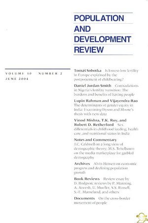 İÇİNDEKİLERARTICLESIs Lowest-Low Fertility in Europe Explained by the Postponement of Childbearing? TOMAS SOBOTKA Contradictions in Nigeria's Fertility Transition: The Burdens and Benefits of Having People DANIEL JORDAN SMITH The Determinants of Gender Equity in India: Examining Dyson and Moore's Thesis with New Data LUPIN RAHMAN VIJAYENDRA RAO Sex Differentials in Childhood Feeding, Health Care, and Nutritional Status in India VINOD MISHRA T. K. ROY ROBERT D. RETHERFORD NOTES AND COMMENTARY Demographic Theory: A Long View JOHN C. CALDWELL The Media Marketplace for Garbled Demography MICHAEL S. TEITELBAUM ARCHIVES Alvin Hansen on Economic Progress and Declining Population Growth BOOK REVIEWS American Eugenicists on Trial: A Review Essay on Edwin Black, War Against the Weak: Eugenics and America's Campaign to Create a Master Race DENNIS HODGSON Dirk Hoerder, Cultures in Contact: World Migrations in the Second Millennium; Donna R. Gabaccia, Italy's Many Diasporas; and Adam McKeown, Chinese Migrant Networks and Cultural Change: Peru, Chicago, Hawaii, 1900-1936 PATRICK MANNING Harriet B. Presser, Working in a 24/7 Economy: Challenges for American Families A. ANEESH Joseph Lee Rodgers and Hans-Peter Kohler (eds.), The Biodemography of Human Reproduction and Fertility ULRICH MUELLER Nadeya Sayed Ali Mohammed, Population and Development of the Arab Gulf States: The Case of Bahrain, Oman and Kuwait SHARON STANTON RUSSELL Howard Phillips and David Killingray (eds.), The Spanish Influenza Pandemic of 1918-19: New Perspectives SVENN-ERIK MAMELUND Short Reviews DOCUMENTS The World Commission on the Social Dimension of Globalization: On the Cross-Border Movement of People ABSTRACTS AUTHORS FOR THIS ISSUE ![]() |