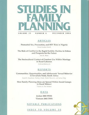 İÇİNDEKİLERSTUDIES IN FAMILY PLANNING VOLUME 35 NUMBER 4 DECEMBER 2004 ARTICLES Premarital Sex, Procreation, and HIV Risk in Nigeria Daniel Jordan Smith The Role of Conflict in the Rapid Fertility Decline in Eritrea and Prospects for the Future Ann K. Blanc The Sociocultural Context of Condom Use Within Marriage in Rural Lebanon Andrzej Kulczycki REPORTS Communities, Opportunities, and Adolescents' Sexual Behavior in KwaZulu-Natal, South Africa Carol E. Kaufman, Shelley Clark, Ntsiki Manzini, and Julian May How Family Planning Ideas are Spread Within Social Groups in Rural Malawi Valerie A. Paz Soldan DATA Jordan 2002: Results from the Population and Family Health Survey Vietnam 2002: Results from the Demographic and Health Survey NOTABLE PUBLICATIONS INDEX TO VOLUME 35 ![]() |