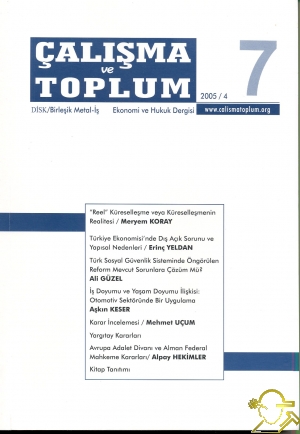 İÇİNDEKİLERÇALIŞMA TOPLUM2005/4 DİSK/Birleşik Metal-İş Ekonomi ve Hukuk Dergisi | www.calismatoplum.org İÇİNDEKİLER "Reel" Küreselleşme veya Küreselleşmenin Realitesi Meryem KORAY .............................................................................. Türkiye Ekonomisi'nde Dış Açık Sorunu ve Yapısal Nedenleri Erinç YELDAN .............................................................................. Türk Sosyal Güvenlik Sisteminde Öngörülen Reform Mevcut Sorunlara Çözüm Mü? Ali GÜZEL ____ İş Doyumu ve Yaşam Doyumu ilişkisi: Otomotiv Sektöründe Bir Uygulama Aşkın KESER.............................................................................. Katar İncelemesi Mehmet UÇUM.............................................................................. Yargıtay Kararlan Avrupa Adalet Divanı ve Alman Federal Mahkeme Kararları Alpay HEKİMLER............................................................................. Kitap Tanıtımı ................................................................... Kavram Endeksi ............................................................................. NOTLARYayın bir derleme çalışması olduğu için yazar ismi olarak genel yayın yönetmeninin ismi verilmiştir. ![]() |