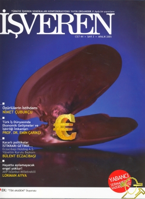 6 BAŞKANDAN - "Türkiye'nin Yabancı Sermayeye İhtiyacı Var" TUĞRUL KUDATGOBİLİK 8 EDİTÖRDEN 'Türk Endüstri İlişkilerinin Yeniden Yapılandın iması Paketi" BÜLENT PİRLER 9 NELER OLUYOR TÜRKİYE l8 PERSPEKTİF 'Türk Dünyasında Ekonomik Gelişmeler ve İşbirliği İmkanları" PROF. DR. EMİN ÇARIKÇI ÇANKAYA ÜNİVERSİTESİ İİBF ULUSLARARASİ TİCARET BÖLÜMÜ ÖĞRETİM ÜYESİ 28 ZOOM "Özürlüler ve İstihdam" TİSK GÖRÜŞÜ 3° ZOOM "Özürlülerin Gelir Getirici Bir İşte Çalışarak Üretken Olmaları Büyük Önem Taşımaktadır" NİMET ÇUBUKÇU KADIN VE AİLEDEN SORUMLU DEVLET BAKANI 34 ZOOM "Özürlülük Bir İnsan Haklan Konusudur" SALİH KILIÇ TÜRK-İŞ GENEL BAŞKANI TÜRKİYE SAKATLARI KORUMA VAKFI BAŞKANI 36 ZOOM "Bizim Köy Engelliler Üretim Merkezi Projesi" ADEM BAĞDATLI KOCAELİ SANAYİ ODASI YÖNETİM KURULU ÜYESİ PROJE KOORDİNATÖRÜ 39 ZOOM "Ulusal Bereket ve İstihdam Yuvalarımız: İşletmeler" TİSK YÜRÜTME KOMİTESİ VE YÖNETİM KURULU ÜYESİ 41 ZOOM "Yabancı Sermayeden Vazgeçemeyiz!" TİSK GÖRÜŞÜ 42 ZOOM "Yabancı Sermayeyi Teşvik Edici Uygulamalara Özen Gösterilmektedir" ÇSG BAKANLIĞI ÇALIŞMA GENEL MÜDÜRÜ ZOOM "Mevcut Kayıtdışılık ve Ağır Vergi Yükleri Altında Yabancı Sermaye Beklentileri Gerçekleştirilemez" ŞABAN ERDİKLER YASED BAŞKANI 48 Z00M "Çalışma İzni Almak Kolaylaştırılmalı" OKTAY VARLIER TÜRKİYE TURİZM YATIRIMCILARI DERNEĞİ YÖNETİM KURULU BAŞKANI 50 ZOOM "Ülkenin Büyümesine Katkılarımız Devam Edecektir" ALAIN GABİLLET OYAK RENAULT OTOMOBİL FABRİKALARI A.Ş. GENEL MÜDÜRÜ 52 ZOOM "Genç Nüfus ve İstihdam Olanaklarının Kısıtlı Olması Yabancı Sermaye Yatırımlarını Gerekli Kılıyor" PROF. DR. SADİ UZUNOĞLU TRAKYA ÜNİVERSİTESİ İİBF ÖĞRETİM ÜYESİ >5 ZOOM "Yabancı Sermayenin Yatırım Dışındaki Yatınmlan" SALİM KADIBEŞEGİL STRATEJİK İLETİŞİM DANIŞMANI ORSA STRATEJİK İLETİŞİM DANIŞMANLIĞI 56 AKADEMİSYEN GÖZÜYLE "Yabancı Yatınmlann Teşviki Açısından Yabancılann Çalışma İzinleri Rejimi" DOÇ. DR. BÜLENT ÇİÇEKLİ POLİS AKADEMİSİ, GÜVENLİK BİLİMLERİ FAKÜLTESİ, DEVLETLER ÖZEL HUKUKU ÖĞRETİM ÜYESİ 60 SÖYLEŞİ "Kararlı Politikalar İstikran Getirdi..." BÜLENT ECZACIBAŞI ECZACIBAŞI HOLDİNG A.Ş. YÖNETİM KURULU BAŞKANI 64 SANAT "Picasso'nun Boğaz Sefası" 66 ' İNSAN DİYE DİYE "Çalışanlarımıza En Güzel Yeni Yıl Hediyesi" DR. SEMA ÖZÇER MAY DANIŞMANLIK 68 HABERLER 83 TARİHTE BU AY 84 RÖPORTAJ "AKP İstanbul Milletvekili Lokman Ayva: Hayatta Aşılamayacak Engel Yoktur" MUHARREM RAHTE 89 ANALİZ "Daha Az Bürokrasi=Daha Az Büyüme" FATİH TOKATLI TİSK ARAŞTIRMA, EĞİTİM VE DIŞ İLİŞKİLER UZMANI 94 ANALİZ " Türkiye'nin Enerji Kaçak ve Kayıp Profili" PROF. DR. MUAMMER KAYA ESKİŞEHİR-OSMANGAZİ ÜNİVERSİTESİ TEKAM MÜDÜRÜ 96 MOZAİK "Eskişehir'den Endüstri ilişkilerine İki Genç Bakış" İSMAİL BAYER 98 ARKEOGEZİ "Ürperten Tarihiyle Kanlı di vane(Kanyteleis) Örenyeri" MUTLU GÜNHAN ÖZCAN 102 AVRUPA AVRUPA IO4 İSTATİSTİK lOÖ YENİ YAYINLAR