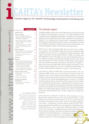 İÇİNDEKİLERLeading articleWork in progress . Health technology equipment in hospitals in Catalonia according to the Register of Equipment . Use and impact of PET on patient clinical management in Catalonia: oreliminary data . Arthroplasty Register of Catalonia: a tool for improving health-care quality Work completed . Sperm washing in HIV-serodiscordant couples that want to have children . Estimation of cardiovascular risk in primary care Teaching Research . Summary of the evaluation process of the research proposals submitted to the 2003 calling of La Fundacio La Marato de TV3 for research in chronic respiratory diseases . 5th CAHTA 2004 call for topics in clinical and health services research CAHTA scientific activity . Epidemiology, a tool for health management . 10 years of the Agency . IRYSS Network Meeting Concepts and methods in assessment . The importance of a taxonomy on patient safety ![]() |