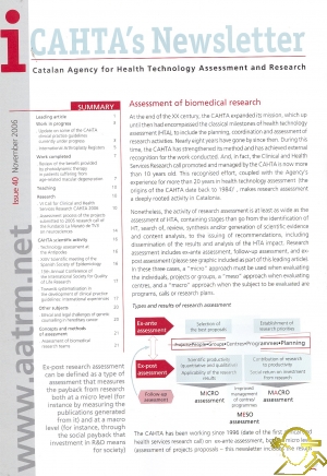 İÇİNDEKİLERLeading article Work in progress. Update on some of the CAHTA clinical practice guidelines currently under progress . International Arthroplasty Registers Work completed . Review of the benefit provided by photodynamic therapy in patients suffering from age-related macular degeneration Teaching Research .VI Call for Clinical and Health Services Research CAHTA 2006 . Assessment process of the projects submitted to 2005 research call of the Fundacio La Maratd de TV3 on neurosciences CAHTA scientific activity . Technology assessment at the Antipodes . XXIV Scientific meeting of the Spanish Society of Epidemiology . 13th Annual Conference of the International Society for Quality of Life Research . Towards systematisation in the development of clinical practice guidelines: international experiences Other subjects . Ethical and legal challenges of genetic counselling in hereditary cancer Concepts and methods of assessment . Assessment of biomedical research teams ![]() |