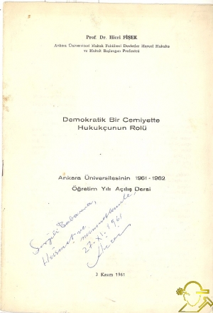 Ankara Üniversitesi Hukuk Fakültesi Devletler Hususi Hukuku ve Hukuk Başlangıcı Profesörü Hicri Fişek'in, Ankara Üniversitesi'nin 1961-1962 öğretim yılı açılış dersi