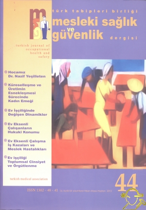 İÇİNDEKİLEREDİTÖRDEN ZOLevent KOŞAR 1 Dr. NAZİF YEŞİLLETEN Mesleki Sağ|ık ve Güvenlik Dergisi Yayın Kurulu 2 KÜRESELLEŞME VE ÜRETİMİN ESNEKLEŞMESİ SÜRECİNDE KADIN EMEĞİ Reyhan ATASÜ TOPÇUOĞLU 3 ENFORMEL SEKTÖRDE YAPILAN BİR İŞ BİÇİMİ OLAN EV İŞÇİLİĞİNDE DEĞİŞEN DİNAMİKLER Sibel KALAYCIOĞLU, Helga RITTERSBERGER TILIÇ 10 BAĞIMLI VE EV EKSENLİ ÇALIŞANLARIN HUKUKİ KONUMU Doğan KESKİN 16 EV EKSENLİ ÇALIŞNLARIN KARŞILAŞTIĞI KAZALAR HASTALIKLAR ve TEHLİKELER Nagihan DURUSOY ÖZTEPE 26 EV İŞÇİLERİ DAYANIŞMA SENDİKASI EV İŞÇİLİĞİ. TOPLUMSAL CİNSİYET VE ÖRGÜTLENME Ayşe A, Burcu K, Demet ., Demet T, Gülhan B, Gülşah H, Hoşgül M, Şöhret A. 32 BİR İŞYERİNDE SİGARA BIRAKMA PROGRAMINA KATILIMI ETKILEYEN ETMENLER Dr. Hediye Aslı DAVAS, Dr. Raika DURUSOY, Dr. Nurcan ÇAKIR PİRGAN 41 HABER 41 ![]() |
