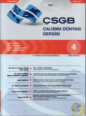İÇİNDEKİLER- Emek- Teknoloji - işsizlik İlişkisi- Relationship Between Labor - Technology- Unemployment Yrd. Doç. Dr. Serdar ORHAN, Fatih SAVUK - Kobiler'de İş Doyumunun Ölçümlenmesine Yönelik Babaeski'de Bir Araştırma - A Research in Babaeski Towards the Measurement of Job Satisfaction of SMES Dr. Serdar CANBAZ, Gülşen DEMİRKOL GEROĞLU - Devlet Memurlarına Yapılan Fazla veya Yersiz Ödemelerin Geri Alınması - Reimbursing the Overpay or Undue Payments Granted to Civil Servants Zafer DEMİRCİ - Uluslararası Kaynakalr ve 6331 Sayılı İş Sağlığı ve Güvenlik Kanunu - International Resources and the Law Occupational Health and Safety No.6331 Dr. Mesut Cemil İŞLER - SEVESO II Direktifi Kapsamında Güvenlik Yönetim Sistemleri - Safety Management System Under SEVESO II Directive Cemal Can AYANOĞLU - Göçmenlik ve Göçmen İşçi Kavramları İle Dış Göç Yapmış İşçilerin Çalışma Hayatında Karşılaştıkları Sorunlar - The Concept of Migration and Migrant Worker and the Problems of Migrant Workers in Working Life Who Have Emigrated Duygu ÇELGİN NOTLARSAYI:2 CİLT:2 MAYIS / AĞUSTOS 2014 ![]() |